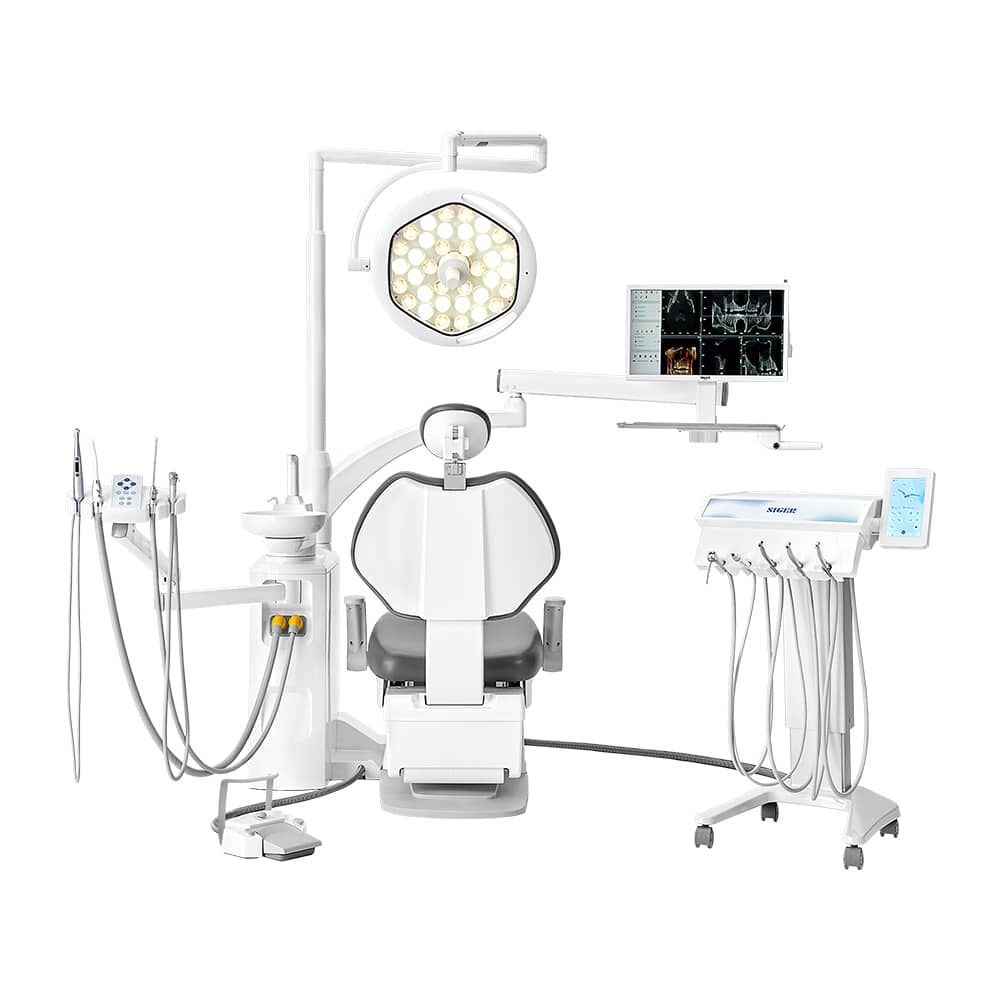 A SIGER S60 fogászati egység mobil kocsival ideális az implantológiai kezelésekhez. A modell kényelmet nyújt mind a páciens, mind a fogorvos számára. Az új vízszintes csúszó technológia megoldja a „hátdörzsölés” problémáját, és a SIGER S60 széket az egyik legkényelmesebbé teszi.